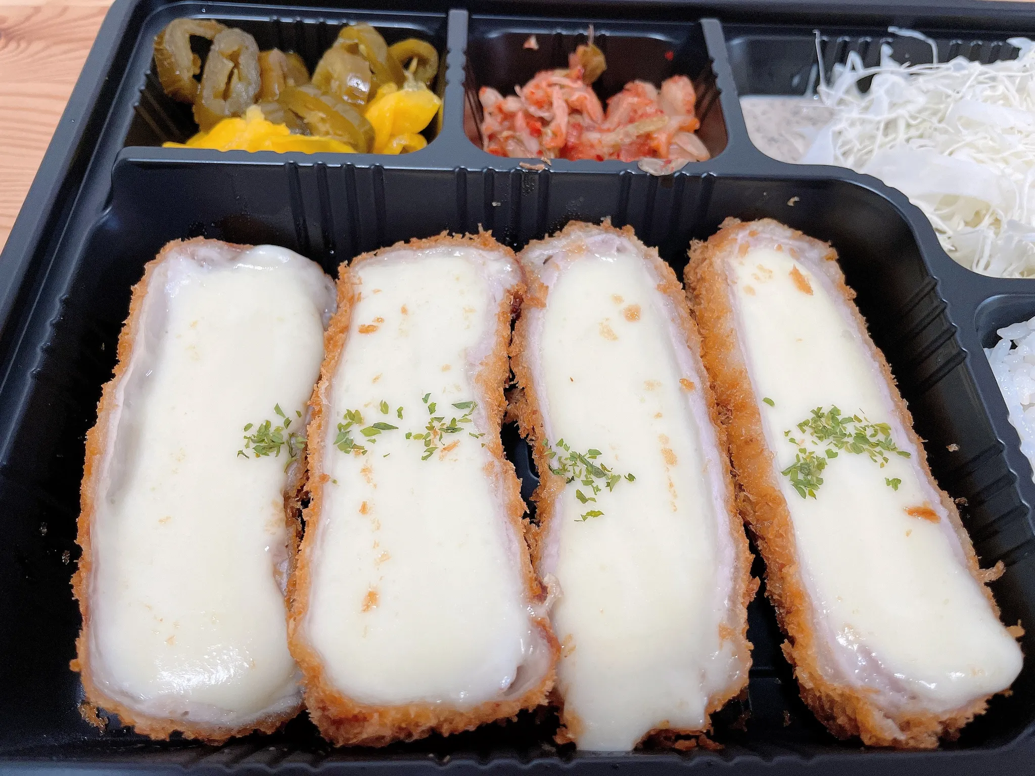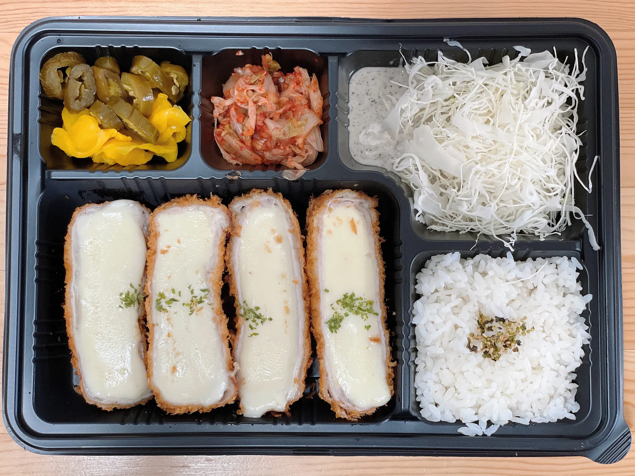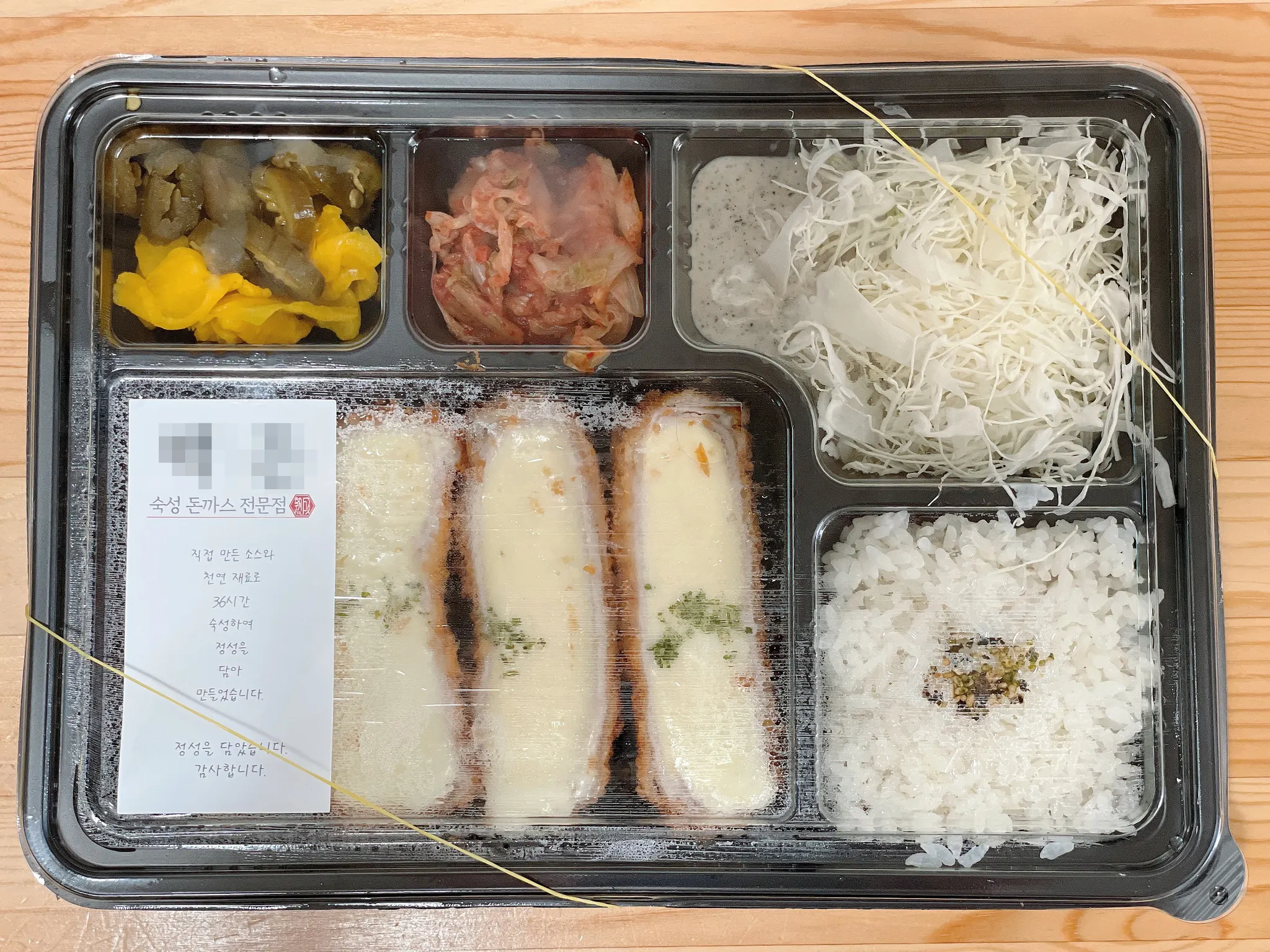 구성은 “수제통치즈돈카츠+수세소스+김치+할라피뇨+단무지+샐러드+밥” 입니다.