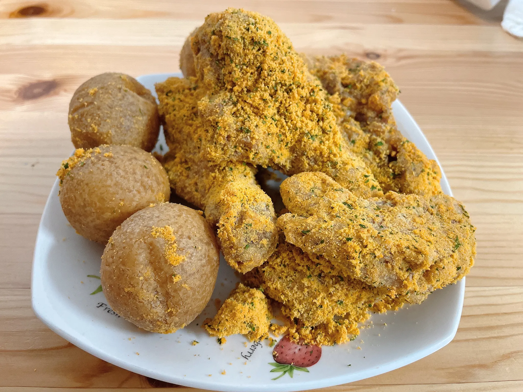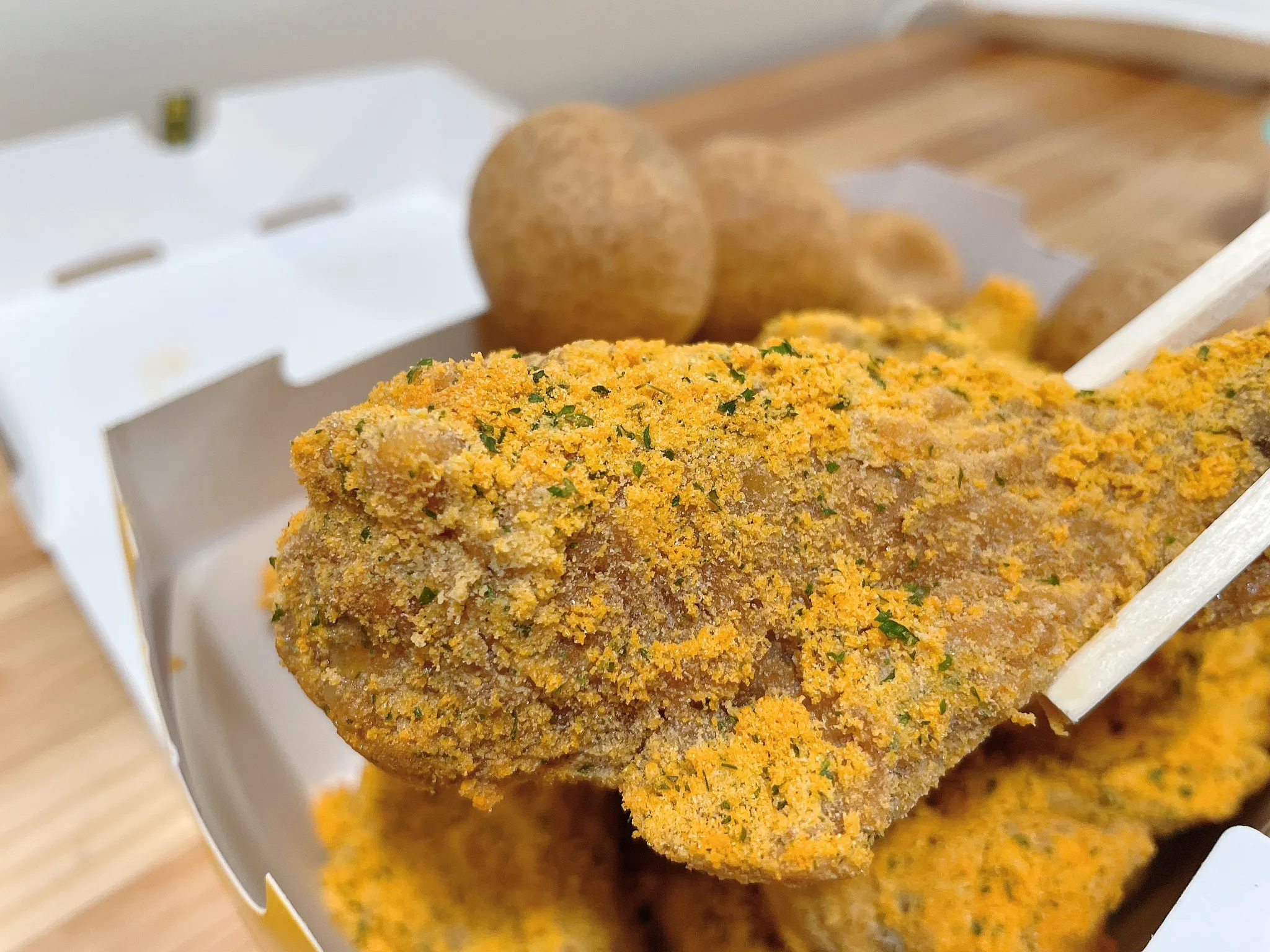 bhc 치킨 뿌링클입니다. 치즈볼은 꺼내어서 치킨 위에 올려놓았습니다.